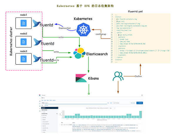 EFK 是 Elasticsearch、Fluentd、Kibana 三个开源软件的首字母缩写,它是业界主流的容器时代日志收集处理的最佳解决方案。Fluentd 是一个日志收集器,负责从各个服务器节点抓取日志。Elasticsearch 是一个搜索存储引擎,可以存储 Fluentd 收集的日志,并提供查询服务。Kibana 是 Elasticsearch 的一个界面化组件,提供 UI 方式查询 Elasticsearch 存储的数据。它们之间数据流是:Log 源> Fluentd 收集 > Elasticsearch > Kibana UI